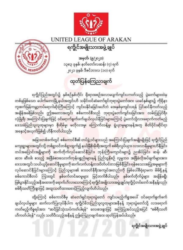 မကြာမီရက်ပိုင်းအတွင်း ကျင်းပတော့မည့် ရခိုင်ပြည်နယ် ပေါက်တောမြို့နယ်၊ မြေငူကျွန်းရှိ ဆံတော်ရှင်ဘုရားပွဲသို့သွားမည့်သူများအနေဖြင့် စစ်ရေးသတိရှိကြရန် ရက္ခိုင့်တပ်တော်(AA)က ယနေ့ ဒီဇင်ဘာ ၁ဝ ရက်တွင် သတိပေးထုတ်ပြန်လိုက်သည်။