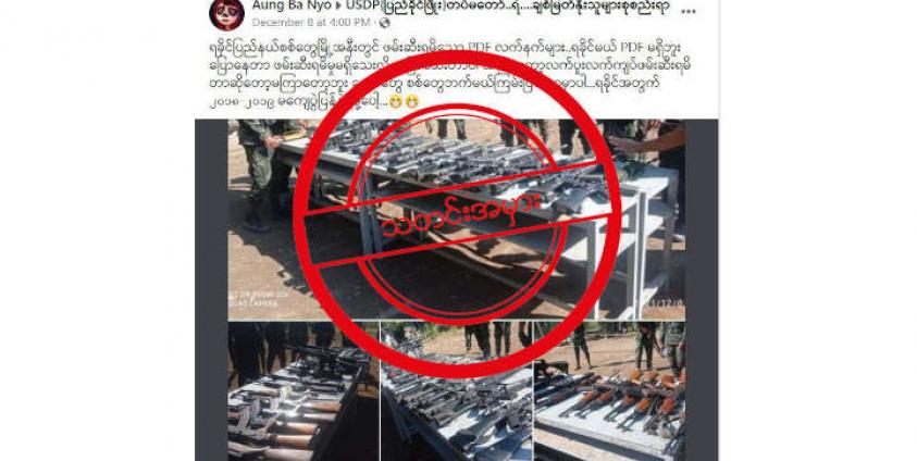 ဓာတ်ပုံနဲ့ တကွ အချက်အလက် အားလုံးကို စစ်ဆေးချက်အရ Aung Ba Nyo ဆိုသူ ရေးသားထားတဲ့စာနဲ့ အသုံး ပြုထားတဲ့ ဓာတ်ပုံဟာ ရခိုင်ပြည်နယ် စစ်တွေမြို့ အနီးမှာ PDF တွေဆီက လက်နက် ဖမ်းဆီးရမိတယ် ဆိုတဲ့ သတင်းအမှား ဖြစ်တယ်ဆိုတာကို စိစစ်တွေ့ရှိရပါတယ်။