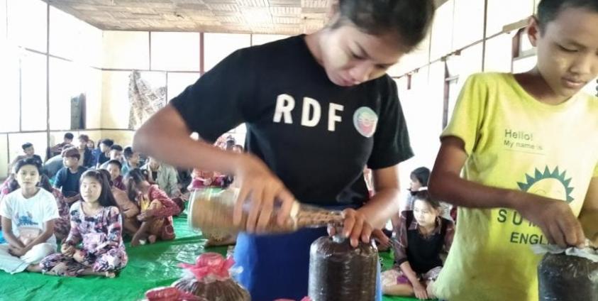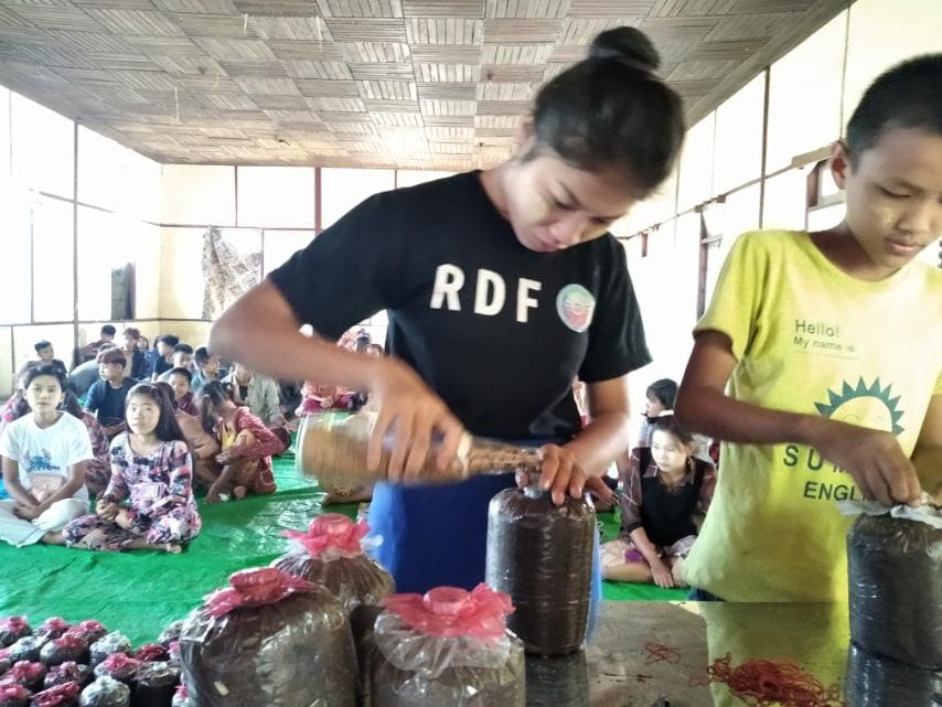 ရခိုင်ပြည်နယ်အတွင်းက ဒေသနေပြည်သူများ အိမ်တွင်းစီးပွားရေးလုပ်ငန်းလုပ်ကိုင်နိုင်ရန် မှိုစိုက်ပျိုးရေးသင်တန်းကို စစ်တွေမြို့ရှိ စစ်ဘေးရှောင်စခန်းများနှင့် အခြားမြို့နယ်များတွင် သင်ကြားပို့ချပေးလျက်ရှိသည်။