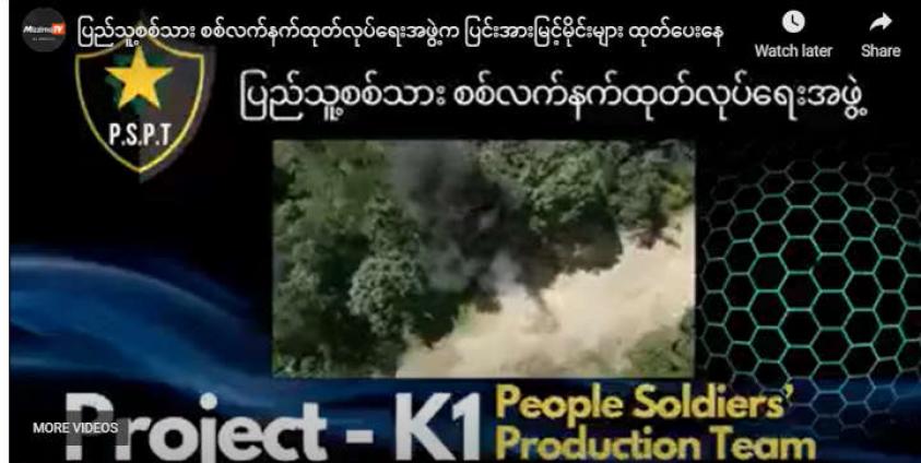 ပြည်သူ့ကာကွယ်ရေးတပ်ဖွဲ့ (PDF) များနှင့် ဒေသကာကွယ်ရေးတပ်ဖွဲ့ (LDF) များ အတွက် ပြင်းအားမြင့် မိုင်းများစွာကို ထုတ်လုပ်ပေးနေပြီ ဖြစ်ကြောင်း ပြည်သူ့စစ်သား စစ်လက်နက် ထုတ်လုပ်ရေးအဖွဲ့ (PSPT) က ဒီဇင်ဘာလ ၁၇ ရက်က သတင်းထုတ်ပြန်သည်။