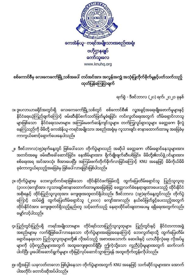 စစ်ကောင်စီအတွင်းရှိ တပ်ဗိုလ်၊ တပ်မှူးများအနေဖြင့် ကျရှုံးနိုင်ငံအဖြစ်ရောက်ရှိနေသည့် နိုင်ငံကို ပြန်လည်ကယ်ဆယ်သည့်အနေဖြင့် ပြည်သူလူထုဘက် ပူးပေါင်းပါဝင်ဖို့ ကရင်အမျိုးသားအစည်းအရုံး KNU က တောင်းဆိုသည့် ကြေငြာချက်တရပ်ကို ဒီကနေ့မှာ ထုတ်ပြန်ခဲ့ပါတယ်။
