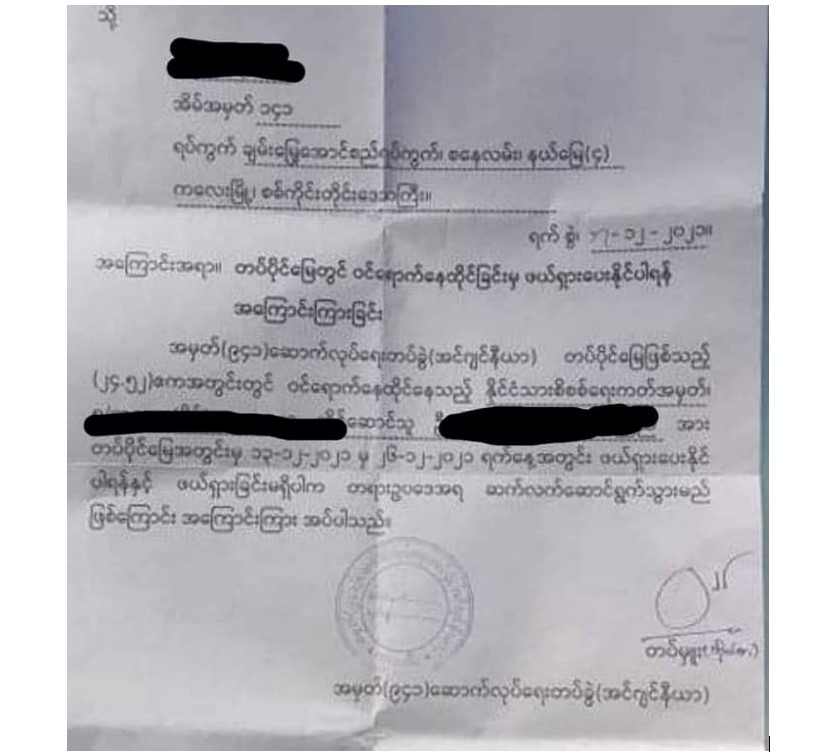 အဆိုပါနယ်မြေသည် အမှတ် (၉၄၁) ဆောက်လုပ်ရေးတပ်ခွဲ (အင်ဂျင်နီယာ) တပ်ပိုင်မြေဖြစ်သည်ဟုဆိုကာ ဒီဇင်ဘာလ ၁၃ ရက်မှ ၂၆ ရက်နေ့အတွင်း ဖယ်ရှားပေးကြရန်နှင့် အကယ်၍ ဖယ်ရှားခြင်းမရှိပါက တရားဥပဒေအရ ဆက်လက် ဆောင်ရွက်သွားမည်ဖြစ်ကြောင်း တပ်မူးကိုယ်တိုင်လက်မှတ်ရေးထားသည့် အကြောင်းကြားစာကို ဒေသခံပြည်သူများ ထံ ပေးအပ်ခဲ့သည်။