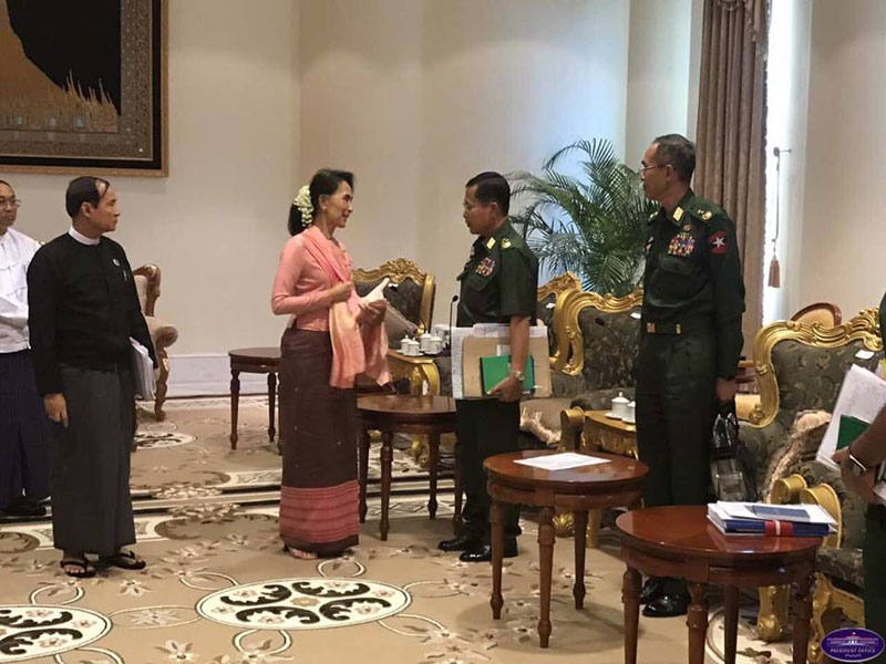 နိုင်ငံတော်အတိုင်ပင်ခံပုဂ္ဂိုလ် ဒေါ်အောင်ဆန်းစုကြည် အပါအဝင် အစိုးရထိပ်ပိုင်းခေါင်းဆောင်များ စုဝေးပြီး ယမန်နေ့ နေ့လည်ပိုင်းက နိုင်ငံတော် သမ္မတ အိမ်တော်မှာ ပြုလုပ်ခဲ့ခြင်း ဖြစ်သည်။
