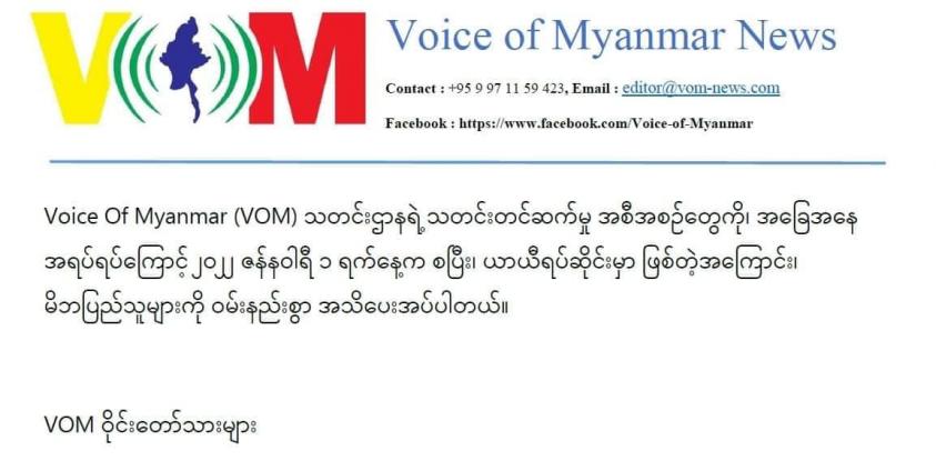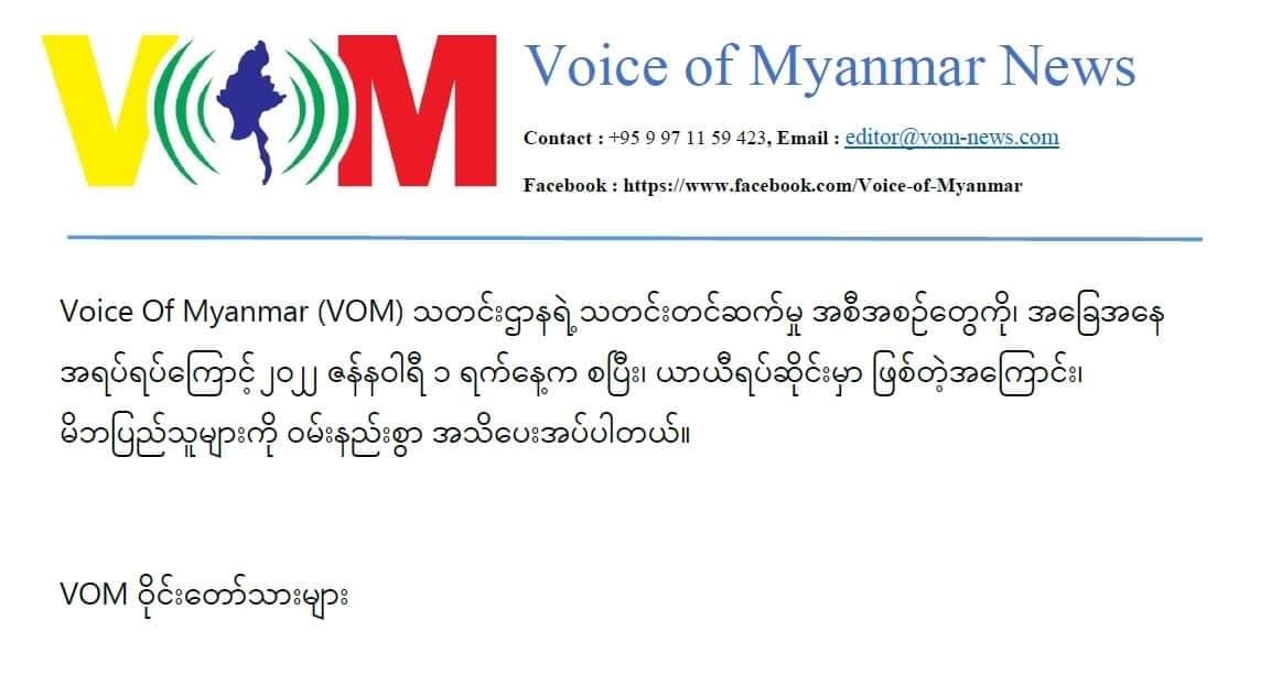မန္တလေးအခြေစိုက် VOM (Voice of Myanmar) သတင်းဌာနကို လာမည့်ဇန်နဝါရီ ၁ ရက်မှစ၍ ယာယီရပ်ဆိုင်းမည်ဖြစ်ကြောင်း ယနေ့ ဒီဇင်ဘာ ၂၄ ရက် နေ့စွဲဖြင့် သတင်းထုတ်ပြန်သည်။