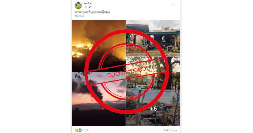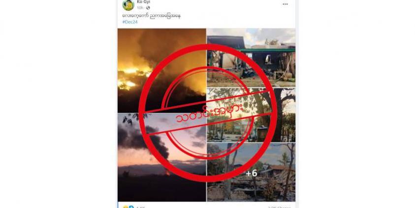ဒီဇင်ဘာလ ၂၃ ရက်နေ့ညက လေးကေ့ကော်ကို စစ်ကောင်စီတပ်က လေယာဉ်နဲ့ ဗုံးကြဲတိုက်ခိုက်ခဲ့တဲ့ ဆိုတဲ့ သတင်းက မှန်ပေမယ့် Ko Gyi ဆိုသူ အသုံးပြုထားတဲ့ ပုံတွေဟာ လေးကေ့ကော် ဖြစ်စဉ်အတွင်းက ပုံတွေ မဟုတ်ပဲ ချင်းပြည်နယ် ထန်တလန်၊ စစ်ကိုင်းတိုင်း နတ်ချောင်းကျေးရွာနဲ့ မကွေးတိုင်း ဂန့်ဂေါမြို့နယ်ထဲက မီးလောင်နေတဲ့ ပုံတွေကို အသုံးပြုထားလို့ပဲဖြစ်ပါတယ်။