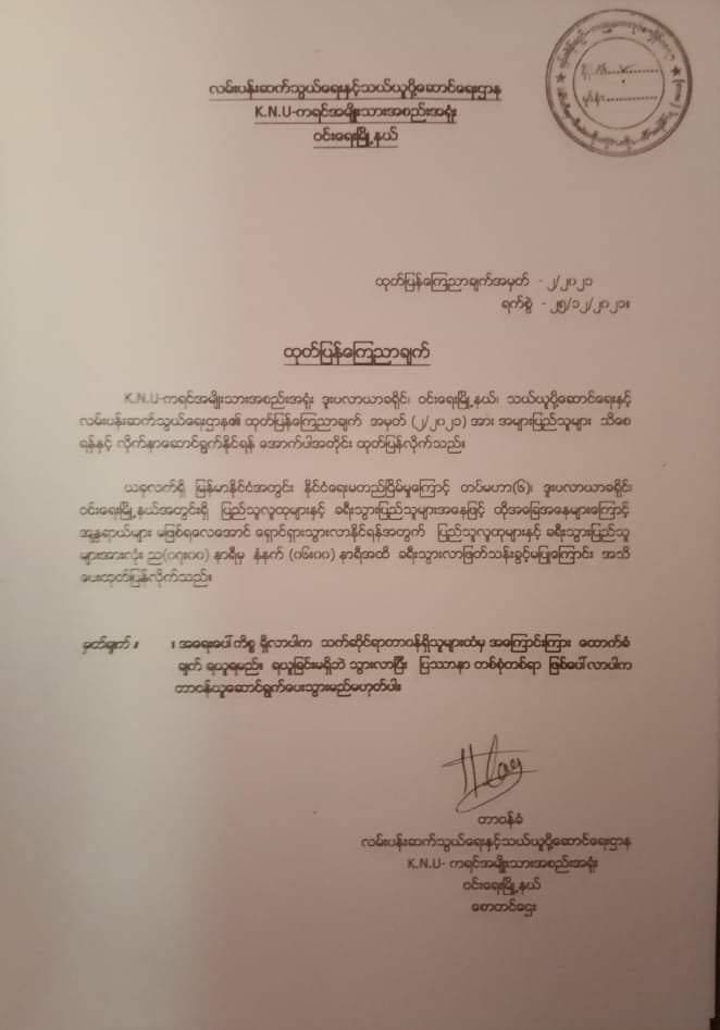 KNU တပ်မဟာ ၆ နယ်မြေအတွင်း ည ၇ မှ နံနက် ၆ နာရီအထိ ခရီးသွားလာဖြတ်သန်းခွင့်မပြုကရင်အမျိုးသားအစည်းအရုံး (KNU) တပ်မဟာ ၆ နယ်မြေအတွင်း ပြည်သူလူထုများနှင့် ခရီးသွားပြည်သူများအားလုံး ည (၇း၀၀) မှ နံနက် (၆း၀၀) နာရီအထိ ခရီးသွားလာဖြတ်သန်းခွင့် မပြုကြောင်း ဒူးပလာယာခရိုင် ဝင်းရေးမြို့နယ် လမ်းပန်းဆက်သွယ်ရေးနှင့် သယ်ယူပို့ဆောင်ရေး ဌာနမှ ထုတ်ပြန်ခဲ့သည်။
