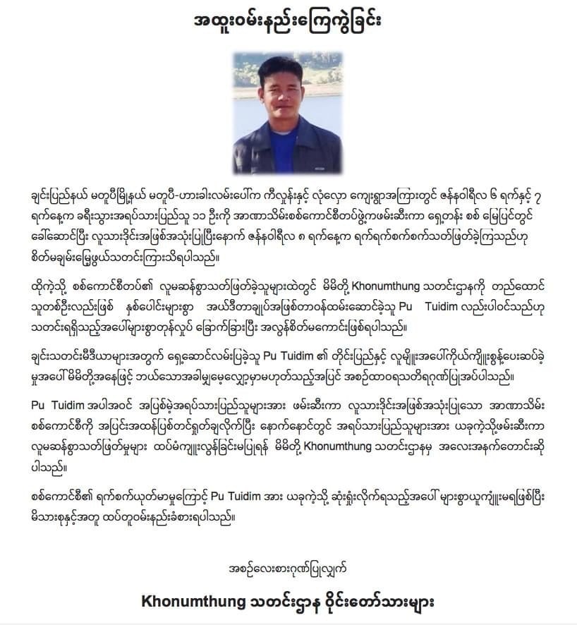ယခုလ ၆ ရက်နှင့် ၇ ရက်နေ့က ချင်းပြည်နယ်၊ မတူပီမြို့နယ်၊ မတူပီ-ဟားခါးလမ်းပေါ်ရှိ ကီလွန်းနှင့် လုံလှော ကျေးရွာတွင် အရပ်သား ၁၁ ဦး စစ်ကောင်စီ၏ ဖမ်းဆီးခံရပြီး လူသားဒိုင်းအဖြစ် အသုံးပြုပြီးနောက် ၈ ရက်နေ့ တွင် သတ်ဖြတ်ခံခဲ့ရမှုတွင် Khonumthung(ခိုနူမ်းသုန်) သတင်းဌာန တည်ထောက်သူ Pu Thidim လည်း ပါဝင်ခဲ့ကြောင်း Khonumthung သတင်းဌာနက အတည်ပြု တည်ပြန်ကြေညာခဲ့သည်။