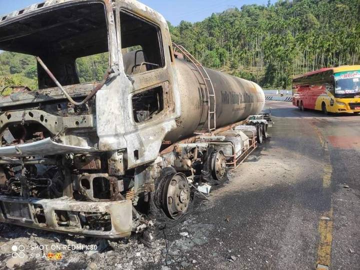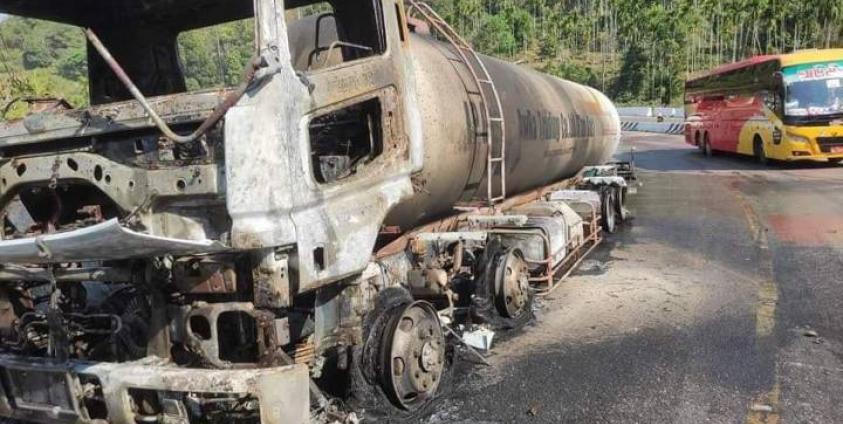 မြဝတီ ကွမ်းခြံကွေ့အနီးမှာ ဂတ်စ်တင်ကားတွေပစ်ခံရ ၊၁ စီးမီးလောင်ပြီး ယာဉ်မောင်းတစ်ဦး သေဆုံးဟုဆို
