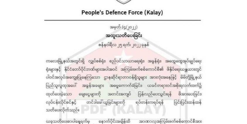 ယခုသတိပေးစာပါနေ့ရက်မှ နောက်ပိုင်းအချိန်ထိ အာဏာလုအကြမ်းဖက်စစ်ကောင်စီအား ဝင်ငွေရရှိစေရန် တစ်နည်းနည်းဖြင့် ဆက်လက်ပူးပေါင်းဆောင်ရွက်နေပါက သက်ဆိုင်ရာပူးပေါင်းဆောင်ရွက်သူများအားလုံးကို ပြင်းထန်စွာ အရေးယူတုံ့ပြန်သွားရန် အသင့်ပြင်ဆင်ထားပြီးဖြစ်ကြောင်းကိုလည်း အထူးသတိပေးလိုက်သည်" ဟု ပြည်သူ့ကာကွယ်ရေးတပ်ဖွဲ့ PDF Kalay မှ အထူးသတိပေးထားသည်။