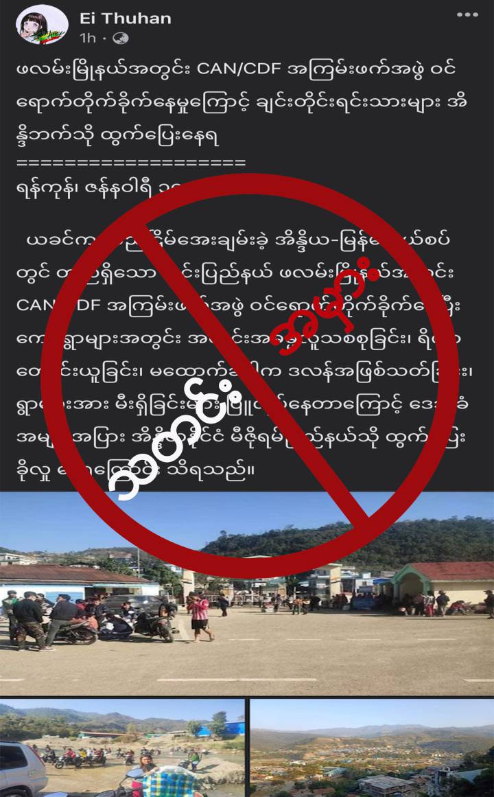 “ဒီသတင်းကတော့ အမှန်မဟုတ်ပါဘူး၊ ကျနော်တို့ CNDF အနေနဲ့လည်း “စစ်တစ်ခါမှ မတိုက်ရဲတဲ့ MARA CDF များက Mizoram ကိုထွက်ပြေးနေကြတဲ့ စစ်ဘေးရှောင်လူငယ်များကို CDF လက်နက်ကိုင် အဖြစ် အတင်းအတမ ခြိမ်းခြောက်ဖမ်းဆီးတယ်ဆိုတဲ့” သတင်းကိုမကြားဘူး၊ ဒီမနက်ကလည်း MARA CDF က သူတို့နာမည်သုံးပြီး ငွေတောင်းခံနေတာကို ရပ်တန့်ဖို့ ထုတ်ပြန်ချက်ထုတ်ထားတယ်၊ ခုဒီကိစ္စလည်းမဖြစ်နိုင်ဘူးလို့ပြောချင်ပါတယ်”