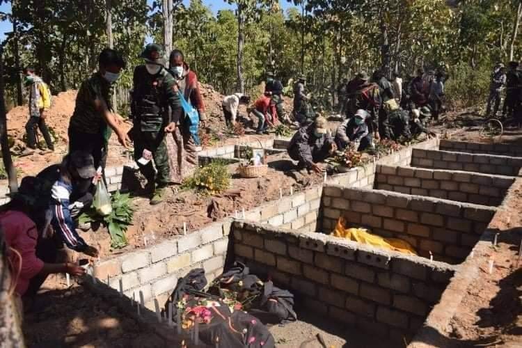 စစ်ကောင်စီ မီးရှို့သတ်ဖြတ်ခဲ့တဲ့ အရိုးစုတွေကို ပြည်သူ့ကာကွယ်ရေးတပ်ဖွဲ့တွေနဲ့ ဆွေမျိုးတချို့တို့က ၂၀၂၁ ဒီဇင်ဘာလ ၂၉ရက်နေ့မှာ ဆုတောင်းပွဲ ပြုလုပ်ပေးနေစဉ်