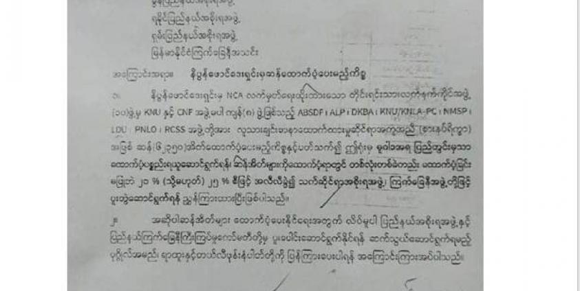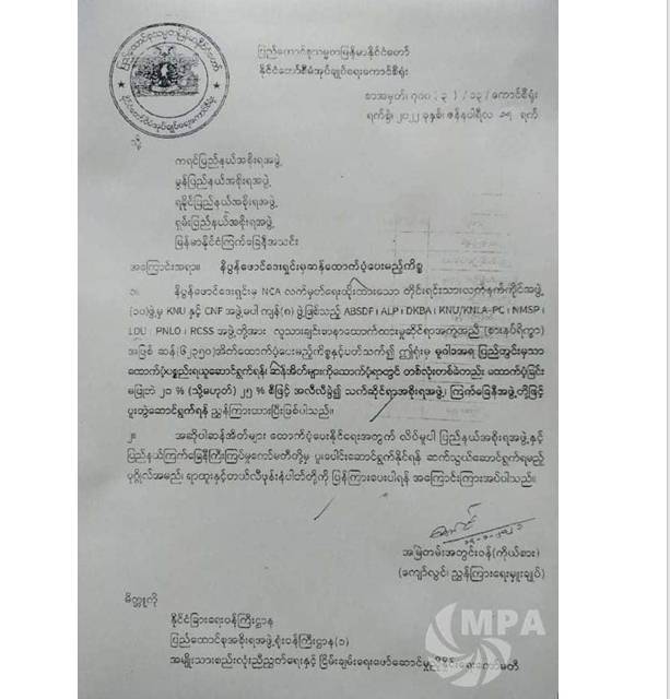 “နီပွန်ဖောင်ဒေးရှင်းမှ NCA လက်မှတ်ရေးထိုးထားသော တိုင်းရင်းသား လက်နက်ကိုင်အဖွဲ့ (၁၀) ဖွဲ့မှ KNUနှင့် CNF မပါ ကျန် (၈) ဖွဲ့ ဖြစ်သည့် ABSDF၊ ALP၊ DKBA၊ KNU/ KNLA/ PC၊ NMSP၊ LDU၊ PNLOနှင့် RCSS အဖွဲ့တို့အား လူသားချင်းစာနာမှုဆိုင်ရာအကူအညီ (စားနပ်ရိက္ခာ)အဖြစ် ဆန်(၆၂၃၅၀) အိတ်ထောက်ပံပေးမည့် ကိစ္စနှင့် ပတ်သက်၍ ဤရုံးမှ မူဝါဒအရ ပြည်တွင်းမှသာ ထောက်ပံ့ပစ္စည်းရယူဆောင်ရွက်ရန်၊ ဆန်အိတ်များကို ထောက်ပံရာတွင် တစ်လုံးတစ်ခဲတည်း ထောက်ပံ့ခြင်း မပြုဘဲ ၂၀ % (သို့မဟုတ်) ၂၅% စီဖြင့် အလီလီခွဲ၍ သက်ဆိုင်ရာအစိုးရအဖွဲ့ ကြက်ခြေနီအဖွဲ့တို့ဖြင့် ပူးတွဲဆောင်ရွက်ရန် ညွန်ကြားထားပြီး ဖြစ်ပါသည်” ဟု ပါရှိသည်။