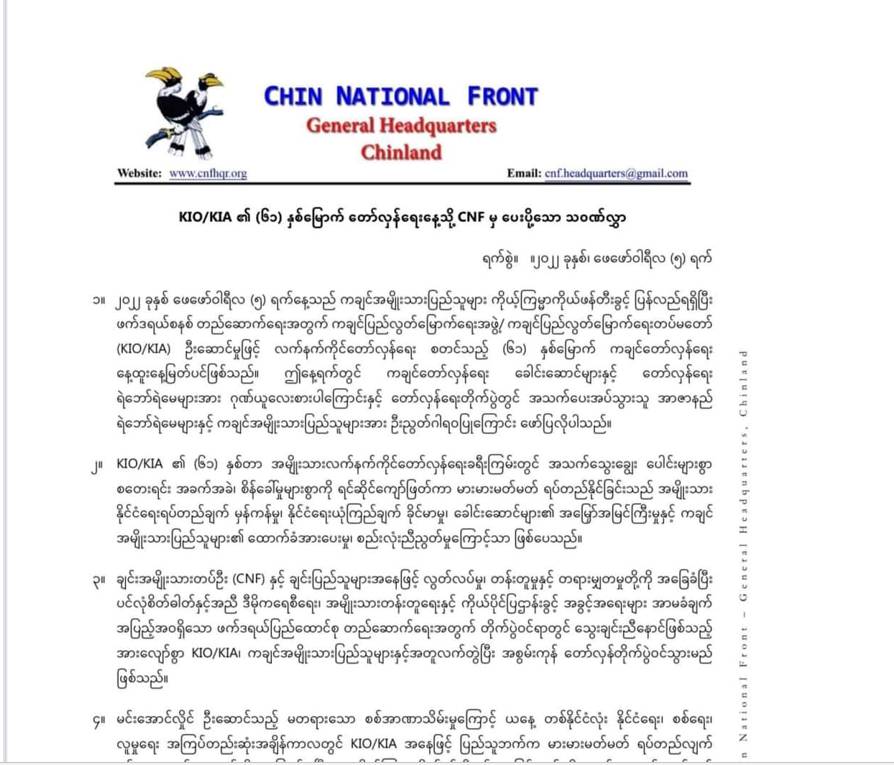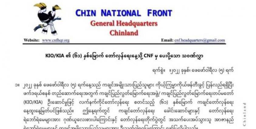 ၂၀၂၂ခုနှစ်၊ဖေဖော်ဝါရီ ၅ရက်နေ့တွင် ကျရောက်သော(၆၁) နှစ်မြောက် ကချင်ပြည်နယ် တော်လှန်ရေးနေ့တွင် ချင်းအမျိုးသားတပ်ဦး (CNF)နှင့် ချင်းပြည်သူများအနေဖြင့် လွပ်လပ်မှု၊တန်းတူမှုနှင့်တရားမျှတမှုကို အခြေခံပြီး ပင်လုံစိတ်ဓတ်နှင့်အညီ ဒီမိုကရေစီအရေး၊အမျိုးသားတန်းတူရေးနှင့် ကိုယ်ပိုင်ပြဌာန်းခွင့် အခွင့်အရေးများ အာမခံချက်အပြည့်အ၀ပါရှိသော ဖက်ဒရယ်ပြည်ထောင်စုတည်ဆောက်ရေးအတွက် တိုက်ပွဲ၀င်ရာတွင် သွေးချင်းညီနောင်ဖြစ်သည့် KIO/KIA ကချင်အမျိုးသားပြည်သူများနှင့်အတူ အစွမ်းကုန်တော်လှန်တိုက်ပွဲ ၀င်သွားမည်ဖြစ်ကြောင်း ချင်းအမျိုးသားတပ်ဦး (CNF) မှ သ၀ဏ်လွှာပေးပို့ခဲ့သည်။
