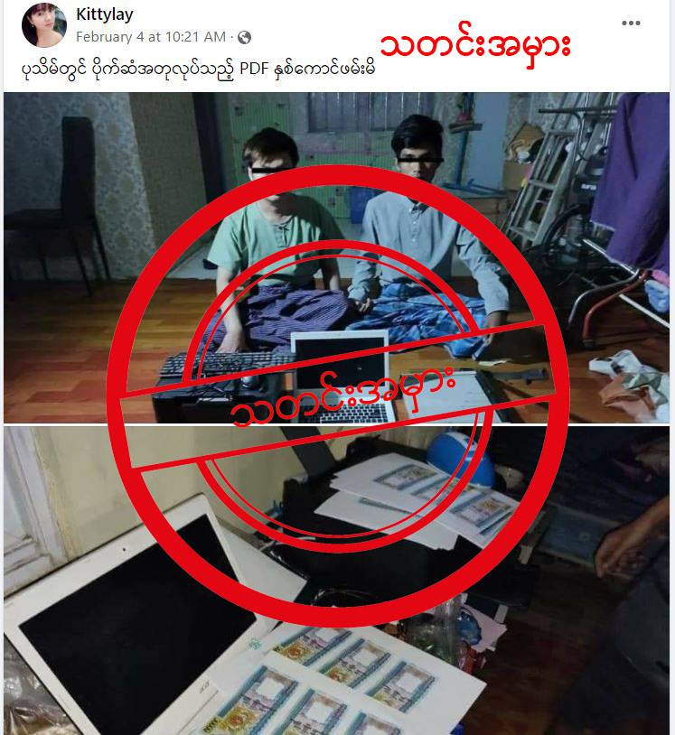 ဧရာ၀တီတိုင်း ပုသိမ်မြို့မှာ ပိုက်ဆံ အတုတွေ လုပ်တဲ့ ပြည်သူ့ကာကွယ်ရေးတပ်ဖွဲ့ PDF ၂ ယောက်ကို ဖမ်းဆီး ရမိ တယ်ဆိုတဲ့ သတင်းပို့စ်တစ်ခုကို Kittylay ဆိုသူ Facebook အကောင့်ပိုင်ရှင်က ဖေဖော်ဝါရီလ ၄ ရက်နေ့မှာ ရေးတင်ထားပါတယ်။
