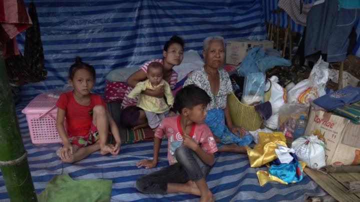ကျမတို့နေရတာ ၁လလောက်ရှိနေပြီး။ ကြုံရာ ခင်းအိပ်နေရတာ။ မိုးမရွာတာပဲ ကံကောင်းတယ်။ ဒါပေမဲ့ အခု မိုးကရွာနေတော့ အမိုးမလုံတော့ ညဘက်ဆိုလည်း ကောင်းကောင်းမအိပ်ရဘူး။ ဝါးနဲ့ ဟိုအပေါက်လှမ်းထိုးဖာလိုက်၊ ဒီအပေါက်လမ်းထိုးဖာလိုက်နဲ့ မအိပ်ရဘူး။ မိုးတအားကြီးရင်တော့လည်း မခြောက်တော့ဘူး။ ဒါပေမဲ့လည်း ထိုင်လို့ရ ရင် အဆင်ပြေပါတယ်။
