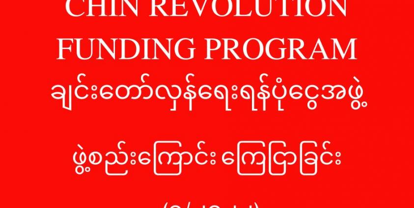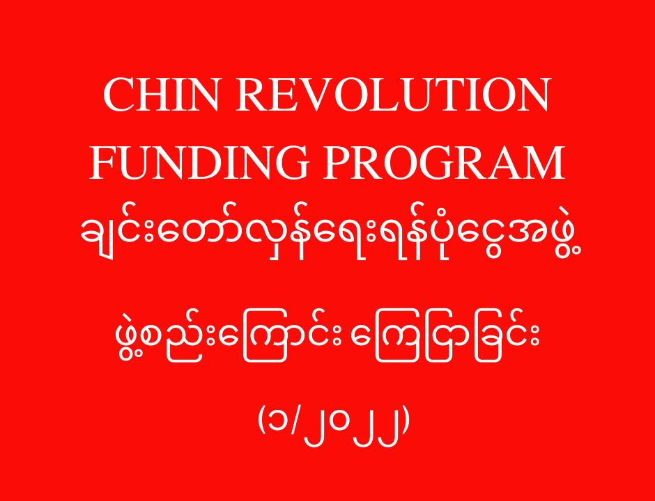 ချင်းအမျိုးသားတော်လှန်ရေးအတွက် လိုအပ်သည့် ရန်ပုံငွေများ အားဖြည့်ပေးနိုင်ရန် Chin Revolution Funding Program - ချင်းတော်လှန်ရေးရန်ပုံငွေအဖွဲ့ကို ၂၀၂၁ ခုနှစ် ဒီဇင်ဘာလ (၁၉) ရက်နေ့တွင် ချင်းအမျိုးသားတော်လှန်ရေးအတွက် စုပေါင်းအားဖြင့် ဘဏ္ဍာငွေရှာဖွေနိုင်သည့် နည်းစနစ်များ ဖော်ဆောင်လျက် ရန်ပုံငွေရှာဖွေရန်၊ ချင်းလူမျိုးမဟုတ်သည့် မည်သည့်လူမျိုးမဆို ချင်းအမျိုးသားတော်လှန်ရေးအတွက် အားဖြည့်ကူညီနိုင်မည့် အခွင့်အလမ်းများကို ဖော်ဆောင်ပေးရန် နှင့် ချင်းတော်လှန်ရေးအင်အားစုများ၏ ဘဏ္ဍာရေးလိုအပ်ချက် ကွက်လပ်အား နောက်တန်းမှ အစွမ်းကုန်ဖြည့်ဆည်းဆောင်ရွက်ပေးရန် ရည်ရွယ်ချက်ဖြင့် ဖွဲ့စည်းခဲ့ပြီးဖြစ်သည်။