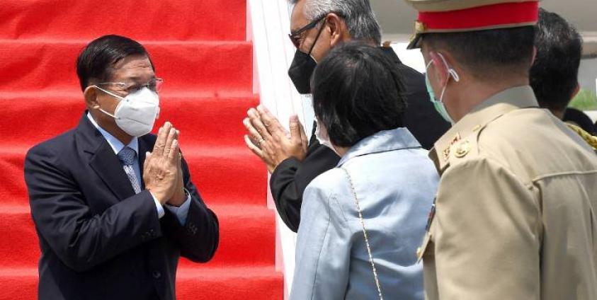 ပုံစာ - ၂၀၂၁ ခုနှစ် ဧပြီလ ၂၄ ရက်နေ့က ကျင်းပသည့် မြန်မာ့အရေး အာဆီယံအထူးအစည်းအဝေး တက်ရောက်ရန် ဂျာကာတာသို့ ရောက်ရှိလာသော မြန်မာစစ်တပ်ခေါင်းဆောင် ဗိုလ်ချုပ်မှူးကြီးမင်းအောင်လှိုင်။ (ဓာတ်ပုံ - AFP)