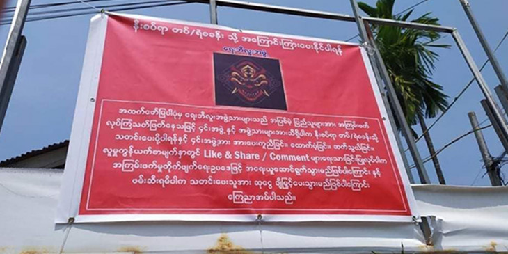 အဆိုပါ ဆိုင်းပုဒ်ကို အောင်မေတ္တာ ရပ်ကွက်ရုံးနှင့် ပြည်ထောင်စုကြံခိုင်ရေးနှင့် ဖွံ့ဖြိုးရေးပါတီ (USDP) ရုံးရှေ့တို့တွင် ဆိုင်းပုဒ်ထောင်ထားခြင်းဖြစ်ကြောင်း ဒေသခံတစ်ဦးက ပြောသည်။