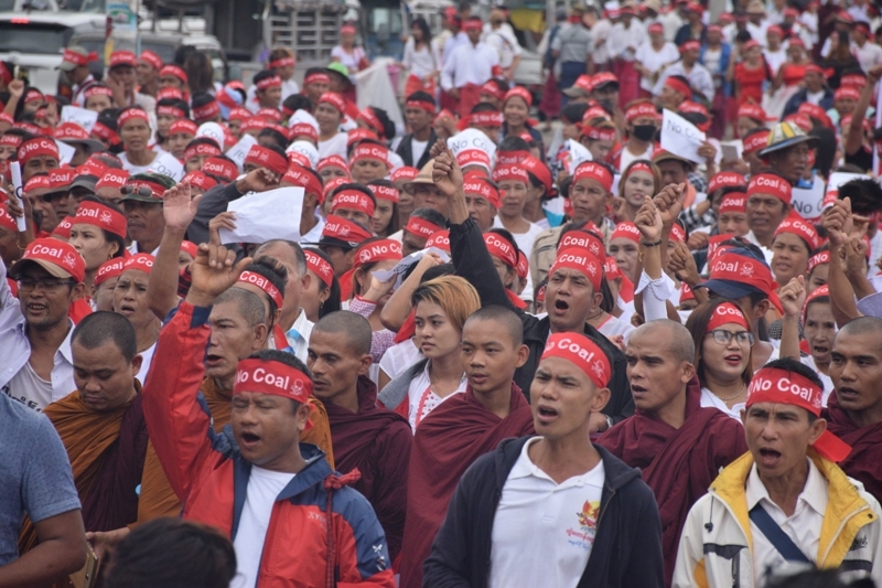 အဆိုပါ ဆန္ဒဖော်ထုတ်ရာတွင် (၁) ကျောက်မီးသွေး ဓါတ်အားပေးစက်ရုံ (အလိုမရှိ)၊ (၂) သဘာဝသယံဇာတမပျက်စီးရေး (ဒို့အရေး)၊ (၃) ကျောက်မိုင်းဖောက်ခွဲမှုလျော့ချရေး (ဒို့အရေး)၊ (၄) ရှေးဟောင်း အမွေအနှစ်များ မပျက်စီးရေး (ဒို့အရေး)၊ (၅) မြစ်ချောင်းညစ်ညမ်း ပျက်စီးမှုကာကွယ်ရေး (ဒို့အရေး)၊ (၆) ကျောက်မီးသွေးဆန့်ကျင်ရေး (အောင်ရမည်) စသည့်ကြွေးကြော်သံများ တောင်းဆိုခဲ့သည်ကို တွေ့ရှိရသည်။