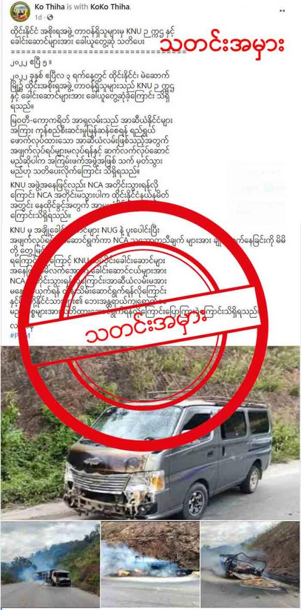 ပြီးခဲတဲ့ ဧပြီလ ၃ ရက်နေ့က KNU ဥက္ကဋ္ဌ ဗိုလ်ချုပ်ကြီး စောမူတူးစေးဖိုးကို ထိုင်းအစိုးရ တာဝန်ရှိသူတွေက ခေါ် ယူတွေ့ ဆုံပြီး NCA စာချုပ် အတိုင်း ဆက်လက် လုပ်ဆောင်ဖို့နဲ့ NCA စာချုပ်အတိုင်း မလုပ်ဆောင်ပါက ထိုင်း နိုင်ငံထဲမှာ နေထိုင်ခွင့်အတွက် အာမမခံဘူးဆိုပြီး ထိုင်းဖက်က ပြောဆိုထားတဲ့ ပုံစံနဲ့ ရေးသားထားတဲ့ သတင်းပို့စ် တစ်ခုကို Ko Thiha ဆိုသူ Facebook အကောင့် ပိုင်ရှင်က ဧပြီလ ၅ ရက်နေ့မှာ တင်ထားတာကို တွေ့ရပါတယ်။