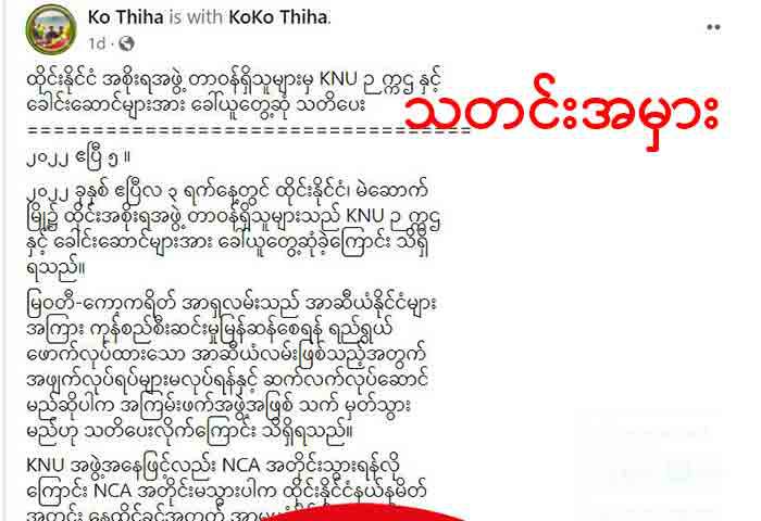 Ko Thiha က “KNU အဖွဲ့အနေဖြင့်လည်း NCA အတိုင်းသွားရန်လိုကြောင်း NCA အတိုင်းမသွားပါက ထိုင်းနိုင်ငံ နယ်နမိတ် အတွင်း နေထိုင်ခွင့်အတွက် အာမမခံနိုင်ပါဟု သတိပေး ကြောင်းသိရှိရသည်။ KNU မှ အချို့ခေါင်း ဆောင်များ NUG နဲ့ ပူးပေါင်းပြီး အဖျက်လုပ်ရပ်များဆောင်ရွက်ကာ NCA သဘောတူညီချက်များအား ချိုး ဖောက်နေခြင်းကို မိမိတို့ တွေ့မြင်နေရကြောင်း ထို့ကြောင့် KNUထိပ်ပိုင်းခေါင်း ဆောင်များအနေဖြင့် မိမိလက် အောက် ခေါင်းဆောင်ငယ်များအား NCAအတိုင်းသွားရန်လိုကြောင်း၊ အာဆီယံ လမ်းမအား မနှောက်ယှက်ရန် ထိန်းသိမ်း ဆောင်ရွက်ရန်လိုကြောင်းနှင့် မိမိတို့နိုင်ငံသားများ၏ ဘေးအန္တရာယ် ကျရောက်စေမည့် ကိစ္စများ အား သတိထား ဆောင်ရွက်ရန်လိုကြောင်းပြောကြားခဲ့ကြောင်းသိရှိရသည်” (မူရင်းအရေး အသား အတိုင်း) ဆိုပြီး ရေးသားထား တာကို တွေ့ရပါတယ်။