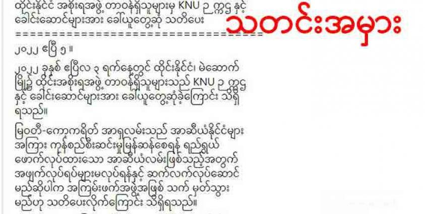 “ထိုင်းနိုင်ငံ အစိုးရအဖွဲ့ တာဝန်ရှိသူများမှ KNU ဥက္ကဌ နှင့် ခေါင်းဆောင်များအား ခေါ်ယူ တွေ့ဆုံ သတိပေး” ဆို တဲ့ ခေါင်းစဉ်နဲ့ Ko Thiha ဆိုသူ ရေးသားထားတာပါ။