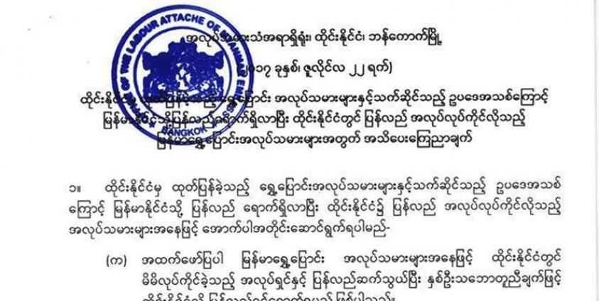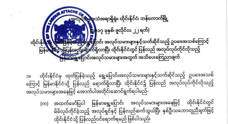ထိုင်းဥပဒေသစ်ကြောင့် မြန်မာနိုင်ငံသို့ ရောက်ရှိလာသော မြန်မာရွှေ့ပြောင်းအလုပ်သမားများ ထိုင်းနိုင်ငံသို့ပြန်လည် အလုပ်လုပ်လိုပါက မိမိလုပ်ကိုင်ခဲ့သော ထိုင်းအလုပ်ရှင်နှင့် ပြန်လည် ဆက်သွယ်၍ နှစ်ဦးသဘောတူညီချက်ဖြင့် ပြန်လည် ဝင်ရောက်နိုင်ကြောင်း ဘန်ကောက်မြို့ရှိ မြန်မာနိုင်ငံ၊ အလုပ်သမားသံအရာရှိရုံးက ဇူလိုင်လ ၂၂ ရက်က အသိပေးစာထုတ်ပြန်လိုက်သည်။