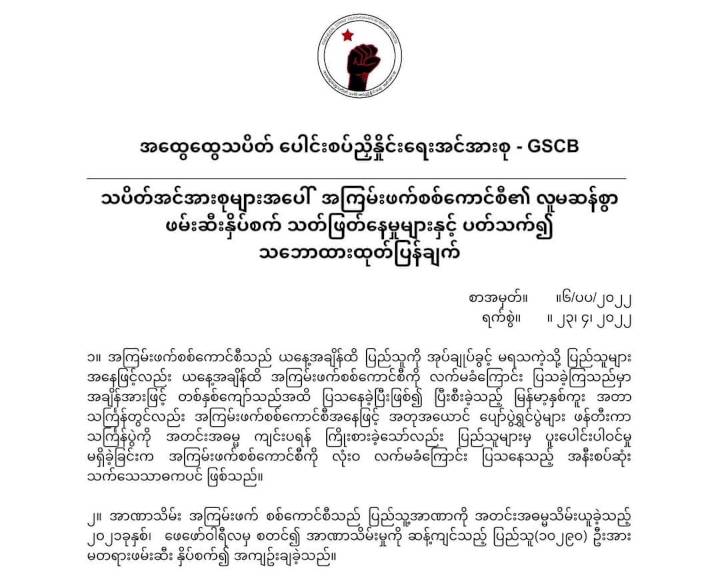 ပြည်သူတွေအနေနဲ့ စစ်တပ်နဲ့ စစ်ကောင်စီရဲ့ လုပ်ရပ်တွေကို မျက်ခြေမပြတ်စောင့်ကြည့်ပြီး အပြည့်အဝအရေးယူနိုင်တဲ့အထိ ဆက်လက်ပြီး ပြတ်ပြတ်သားသား ဆန့်ကျင်တော်လှန်ကြဖို့ GSCBက တိုက်တွန်းနှိုးဆော်ထားတာပါတယ်။
