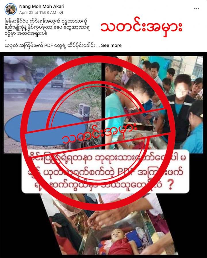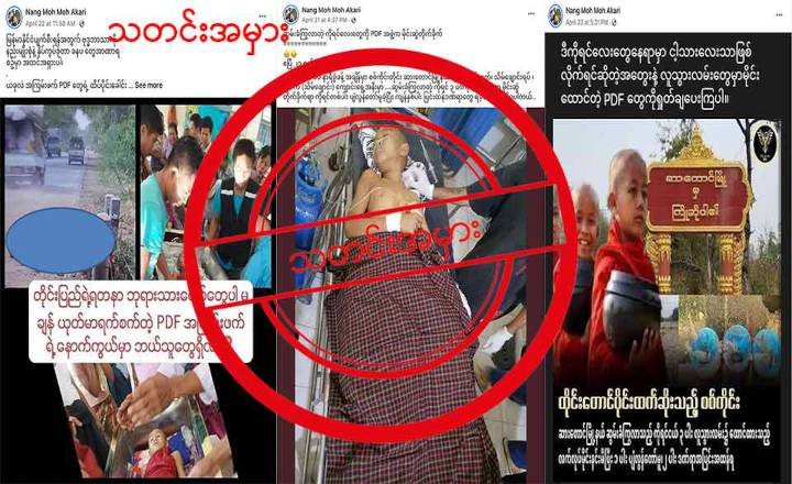 ကိုရင်တစ်ပါး ဆေးကုသမှု ခံယူနေတဲ့ ပုံတစ်ပုံကို အသုံးပြုပြီး “ဆွမ်းခံကြွလာ တဲ့ ကိုရင်လေးတွေကို PDF အဖွဲ့ က မိုင်းဆွဲတိုက်ခိုက်” ဆိုတဲ့ ခေါင်းစဉ်နဲ့ Nang Moh Moh Akari က ရေးတင်ထားတာကို တွေ့ရပါတယ်။
