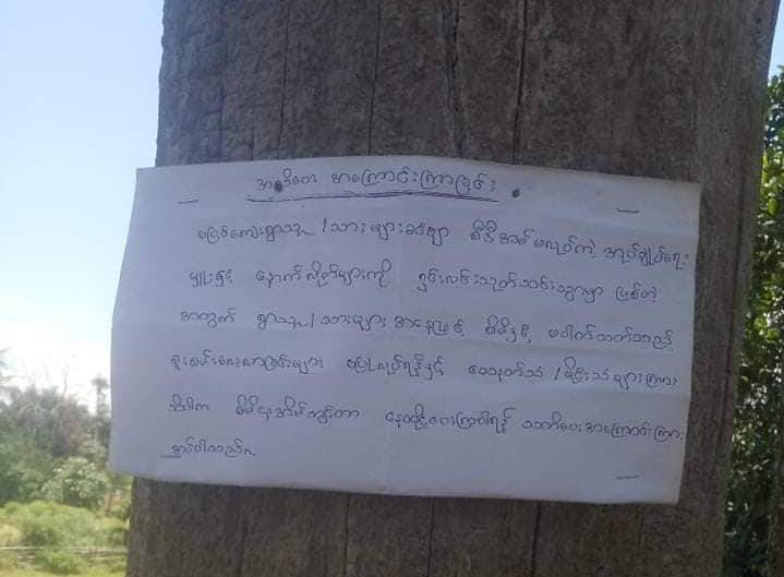 ဒီီလို့သတိပေးစာက မပြင်ကျေးရွာတစ်ခုတည်းမှာကပ်ထားတာဖြစ်ပြီး ကျန်တဲ့ကျေးရွာတွေမှာ မတွေ့ရသေးဘူးလို့လည်း ပြောဆိုကြပါတယ်