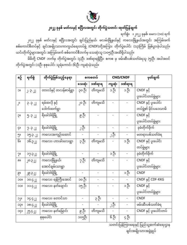 CNO/CNDF မှ ပြောရေးဆိုခွင့်ရှိသူ ဆလိုင်းကျုံးငိုင်က “နှစ်လတာ ခြုံကြည့်မယ်ဆိုရင် မတ်နဲ့ဧပြီကြတော့ ကလေးဖက်မှာ ဖြစ်တာများမယ်၊ နောက်ပြီးတော့ ရိခေါ ဒါရ်မှာ ဖြစ်တာများတယ်။ မတ်လတုန်းကတော့ အခုပြန်နေတဲ့ယာဉ်တန်းတက်လာတဲ့အချိန်မှာ တားလ်ရွာကြားမှာ စဖြစ်တာ။ စစ်ကောင်စီဖက်ကသေတာ တစ်ရာ့ငါးဦးနဲ့ ဒဏ်ရာရတဲ့သူကများတယ် တိကျယူလို့မရတော့။ ကျွန်တော်တို့ CNDF ဖက်က တိုက်ပွဲမှာ ကျတဲ့သူနဲ့ သူတို့ဖမ်းဆီးပြီး သတ်ဖြတ်တဲ့သူရော ၆ ဦးရှိတယ်” ဟု ပြောသည်။