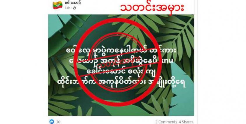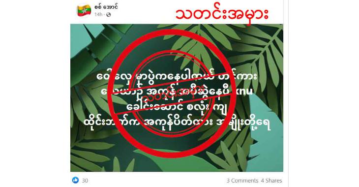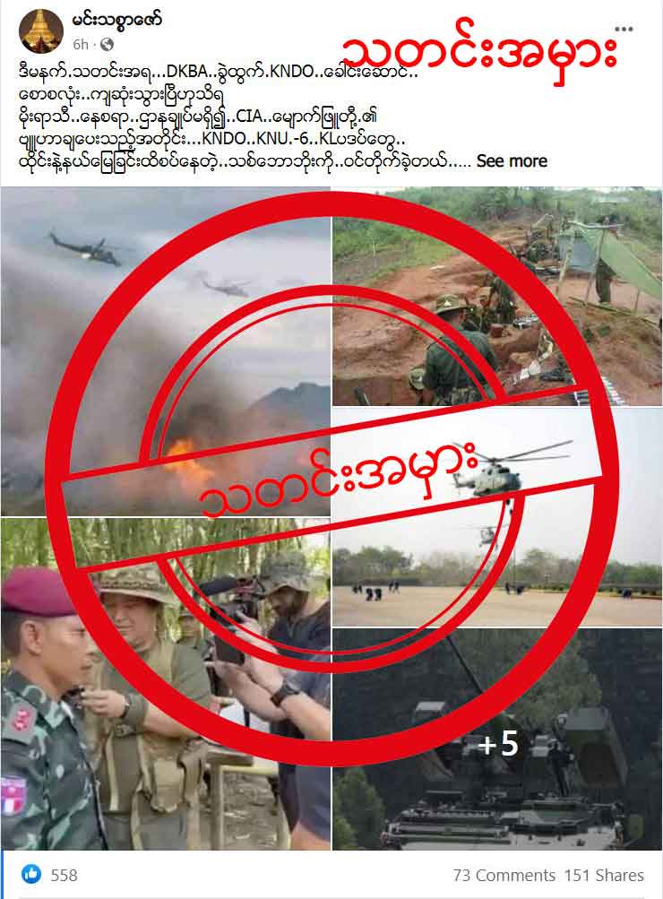 ဒါကြောင့် အချက်အလက်တွေကို စစ်ဆေးကြည့်လိုက်တဲ့အခါမှာ စစ်တပ်ထောက်ခံသူတွေဖြစ်တဲ့ စစ်အောင်နဲ့ မင်းသစ္စာဇော်ဆိုသူတို့ဟာ မနေ့က ဖြစ်ပွားခဲ့တဲ့ တိုက်ပွဲကို အခြေပြုပြီး မြေပြင်မှာ တကယ်ဖြစ်ပွားခဲ့ခြင်း မရှိတဲ့ အကြောင်းအရာတစ်ခုကို ဖန်တီးကာ စိတ်ဓာတ် ပိုင်းဆိုင်ရာကအစ အဖက်ဖက်က ကျဆုံးနေတဲ့ စစ်ကောင်စီ တပ်ဖွဲ့ဝင် တွေကို စိတ်ဓာတ်မြှင့်တက်စေတဲ့သဘောနဲ့ ရည်ရွယ်ချက်ရှိရှိ ဝါဒဖြန့်ရေးသားထားတဲ့ သတင်းအမှား တစ်ခုဖြစ်တယ်ဆိုတာကို စိစစ်တွေ့ရှိရပါတယ်။