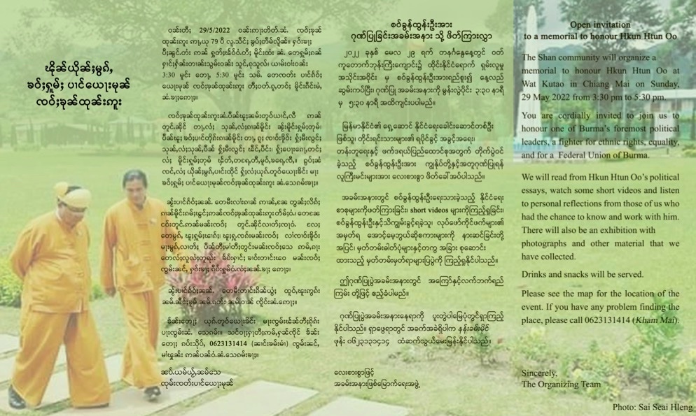 လာမည့် မေ ၂၉ ရက်တွင် စဝ်ခွန်ထွန်းဦး သေဆုံးသည့် ၁ လပြည့်အနေဖြင့် ထိုင်းနိုင်ငံ ချင်းမိုင်မြို့ ၀တ်ကူတောက်ဘုန်းကြီးကျောင်းတွင် ထိုင်းနိုင်ငံရောက် သျှမ်းလူမှု အသိုင်းအ၀ိုင်းမှ စ၀်ခွန်ထွန်းဦး အားရည်စူးပြီး နေ့ဆွမ်းကပ်ပြီး မွန်းလွဲပိုင်း ၃ နာရီခွဲမှ ၅ နာရီခွဲအထိ ကျင်းပသွားမည်။