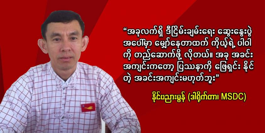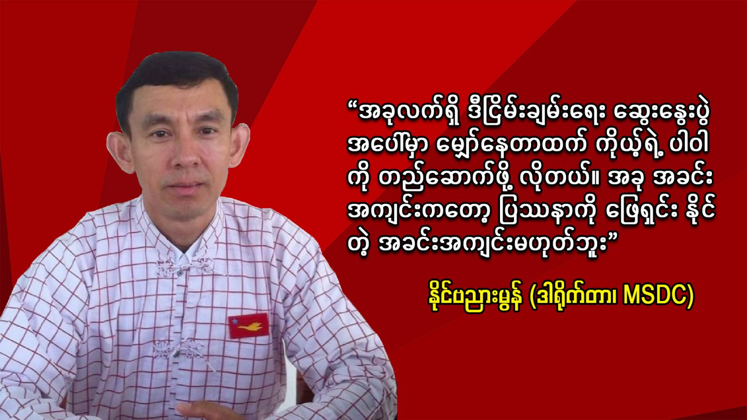 “အခုလက်ရှိ ဒီငြိမ်းချမ်းရေး ဆွေးနွေးပွဲအပေါ်မှာ မျှော်နေတာထက် ကိုယ့်ရဲ့ ပါဝါကို တည်ဆောက်ဖို့ လိုတယ်။ အခု အခင်းအကျင်းကတော့ ပြဿနာကို ဖြေရှင်း နိုင်တဲ့ အခင်းအကျင်းမဟုတ်ဘူး” နိုင်ဗညားမွန် (ဒါရိုက်တာ၊ MSDC)