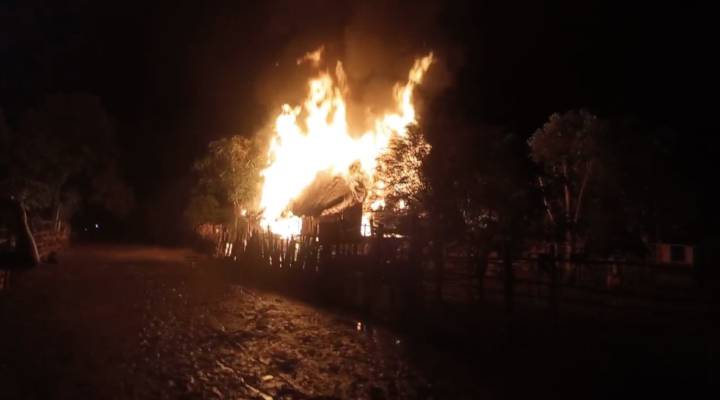 လက်နက်ကြီး ကျရောက် ပေါက်ကွဲပြီး မီးလောင်ကျွမ်း နေတဲ့ ခူးဗျားရယ် အစ်မ နေအိမ်။