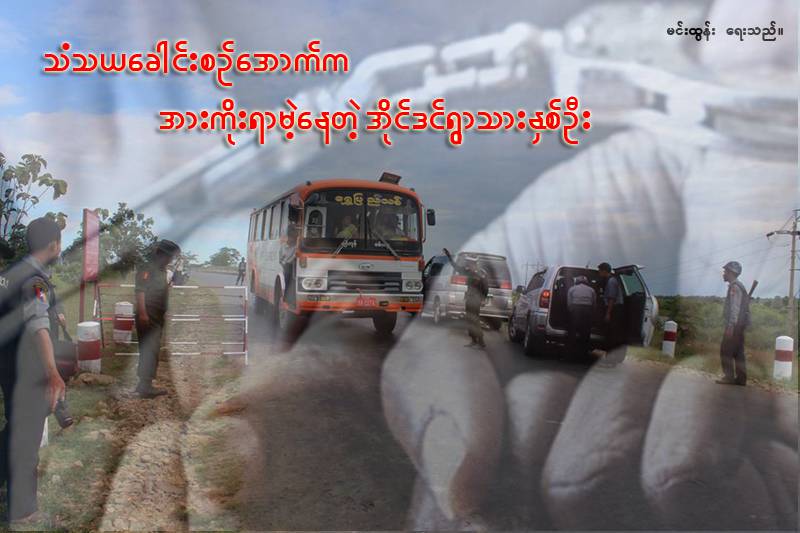 သံဆူးကြိုးတွေနဲ့ပြုလုပ်ထားတဲ့ အတားအဆီးတွေကို စစ်ဆေးရေးဂိတ်ရဲ့ ရှေ့တည့်တည့်နဲ့ မလှမ်းမကမ်းနေရာတွေမှာချထားပြီး အရှေ့ကဖြတ်သွားတဲ့ ကား၊ ဆိုင်ကယ်တွေကို ရပ်တန့်စစ်ဆေးနေပါတယ်။