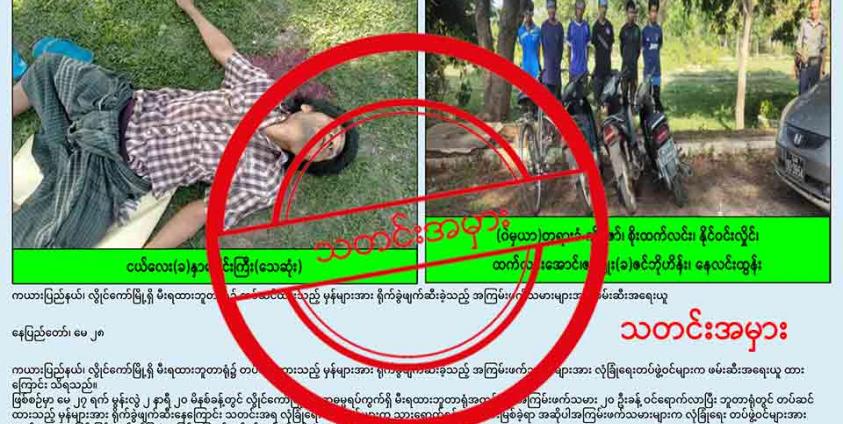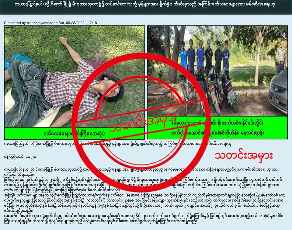 သာမန်အရပ်သား ပြည်သူတွေဖြစ်တဲ့ အဲဒီလူတွေကို အကြမ်းဖက်သမားပါ ဆိုပြီး စစ်ကောင်စီရဲ့ ထုတ်ပြန်ပြော ဆိုမှုဟာ သတင်းအချက်အလက်အမှားတွေကို အခြေခံထားတဲ့ သတင်းအမှားဖြစ် တယ်ဆိုတာကို စိစစ်တွေ့ ရှိရ ပါတယ်။