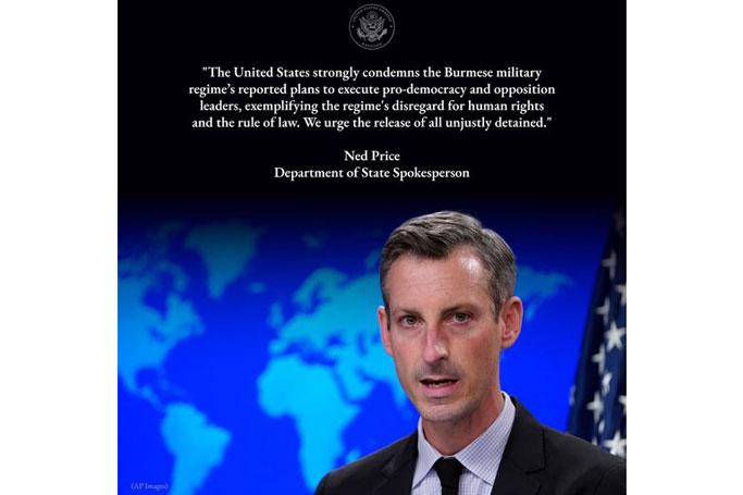 "ဒီမိုကရေစီလိုလားသည့် အတိုက်အခံခေါင်းဆောင်များကို ကွပ်မျက်ရန် မြန်မာစစ်အာဏာရှင်အဖွဲ့အစည်း၏ သတင်းထုတ်ပြန်ချက်သည် စစ်အာဏာရှင်အဖွဲ့အစည်းက လူ့အခွင့်အရေးနှင့် တရားဥပဒေစိုးမိုးရေးကို ဂရုမစိုက်ကြောင်း သာဓကပြလျက်ရှိပြီး အမေရိကန်ပြည်ထောင်စုက ပြင်းထန်စွာ ရှုတ်ချသည်" ဟု ရေးသားထားသည်။