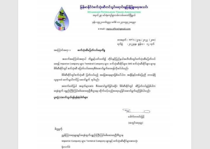 အဆိုပါ ထုတ်ပြန်ချက်ကို မြန်မာနိုင်ငံ စက်သုံးဆီတင်သွင်းဖြန့်ဖြူးရောင်းချသူများအသင်းက ဇွန် ၁၂ ရက်က ထုတ်ပြန်ကြေညာခဲ့ခြင်း ဖြစ်သည်။
