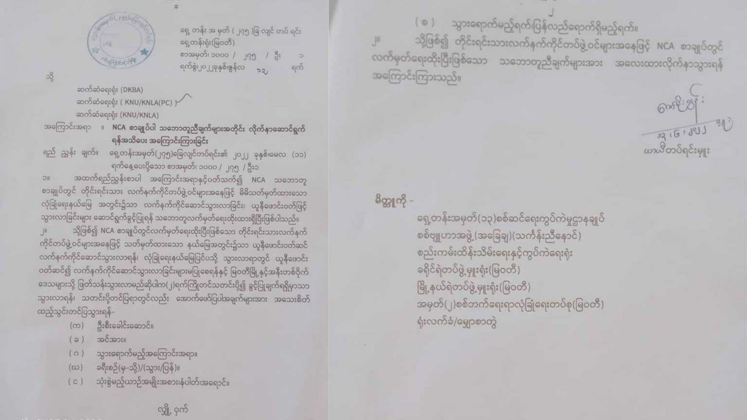 NCA အပစ်ရပ်ထိုးထားသည့် KNU အနေဖြင့် စစ်ကောင်စီ၏ ငြိမ်းချမ်းရေး ဖိတ်ခေါ်မှုအား မတက်ရောက်နိုင် ကြောင်း အကြောင်းပြန်ထားသည့်အချိန် စစ်ကောင်စီဘက်မှ အပစ်ရပ်လက်နက်ကိုင်အဖွဲ့များအပေါ် နယ်မြေ ကျော်လွန် သွားလာခွင့်အား ကန့်သတ်သည့် အသိပေးစာထွက်ပေါ်လာခြင်းဖြစ်သည်။