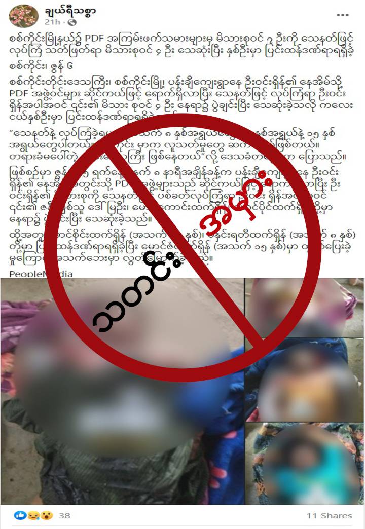 စစ်ကိုင်းမြို့နယ်မှာ PDF အကြမ်းဖက်သမားများမှ မိသားစုဝင် ၇ဦးကို သေနတ်နဲ့ လုပ်ကြံသတ်ဖြတ်ရာ မိသားစု ၄ ဦး သေဆုံးပြီး နှစ်ဦးမှာ ပြင်းထန်ဒဏ်ရာရရှိဆိုတဲ့ သတင်းအမှား