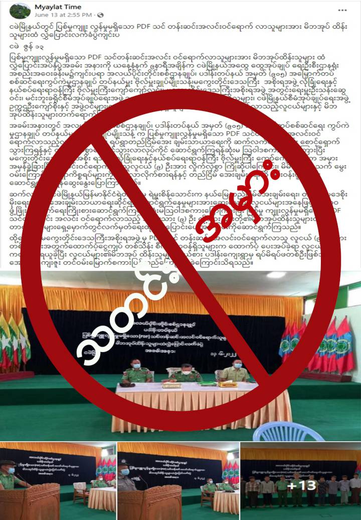 ဒီသတင်းအမှားကို Myaylat Time ဆိုတဲ့ စစ်ကောင်စီဝါဒဖြန့်မီဒီယာတစ်ခုက “အခမ်းအနားတွင် အလယ်ပိုင်းတိုင်းစစ်ဌာနချုပ်၊ ပဒါန်းတပ်နယ် အမှတ် (၉၀၅) အမြှောက်တပ်စစ်ဆင်ရေး ကွပ်ကဲမှုဌာနချုပ် တပ်နယ်မှူး ဗိုလ်မှူးချုပ်မျိုးသန့် က ပြစ်မှုကျူးလွန်မှုမရှိသော PDF သင်တန်းဆင်း အလင်းဝင်ရောက်လာသည့်လူငယ်များအား ရပ်ရွာတည်ငြိမ်အေး ချမ်းသာယာရေးကို ဆက်လက်ထိန်းသိမ်း စောင့်ရှောက်သွားကြရန်နှင့် လွတ်လပ်စွာနေထိုင်သွားလာလုပ်ကိုင် ဆောင်ရွက်ကြရန်ဆုံးမ ဩဝါဒစကား ပြောကြားပြီး မကွေးတိုင်းဒေသကြီးအစိုး ရအဖွဲ့ လုံခြုံရေးနှင့်နယ်စပ်ရေးရာဝန်ကြီး ဗိုလ်မှူးကြီး ကျော်ကျော်လင်းက အမှားအမှန်ခွဲခြားပြီး အလင်းဝင်ရောက်လာသူလူငယ် (၉) ဦးအား လှိုက်လှဲစွာ ကြိုဆိုပါကြောင်း၊ မိမိတို့၏အသက် မွေးဝမ်းကြောင်းဆိုင်ရာကိစ္စရပ်များကို လေ့လာလိုက်စားရန်နှင့် တည်ငြိမ် အေးချမ်းရေးကို ဝိုင်းဝန်းပူးပေါင်းဆောင်ရွက်ကြရန်ဆွေးနွေးပြောကြားသည်။” လို့ရေးသားဖော်ပြထားတာဖြစ်ပါတယ်။