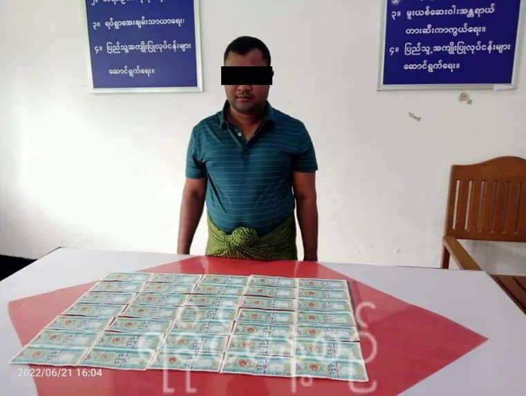 ပြီးခဲ့သည့် ဇွန်လ ၂၁ရက်နေ့က စစ်တွေမြို့ ဧရာဝတီဘဏ်တွင် တစ်သောင်းတန်ငွေတု သုံးသိန်းငါးသောင်းကို စစ်ဆေးတွေရှိခဲ့ခြင်းဖြစ်ပြီး အဆိုပါ ဖမ်းဆီးရမိသူမှာ ဈေးဆိုင်ရောင်းချနေသူဖြစ်ကာ ၎င်းအား အမှတ်(၁) ရဲစခန်းသို့ စစ်ဆေးရန် ပို့ဆောင်ခဲ့ကြောင်း ပြည်နယ်စစ်ကောင်စီ၏ သတင်းပြန်ကြားရေးစာမျက်နှာတွင် ဖော်ပြခဲ့သည်။