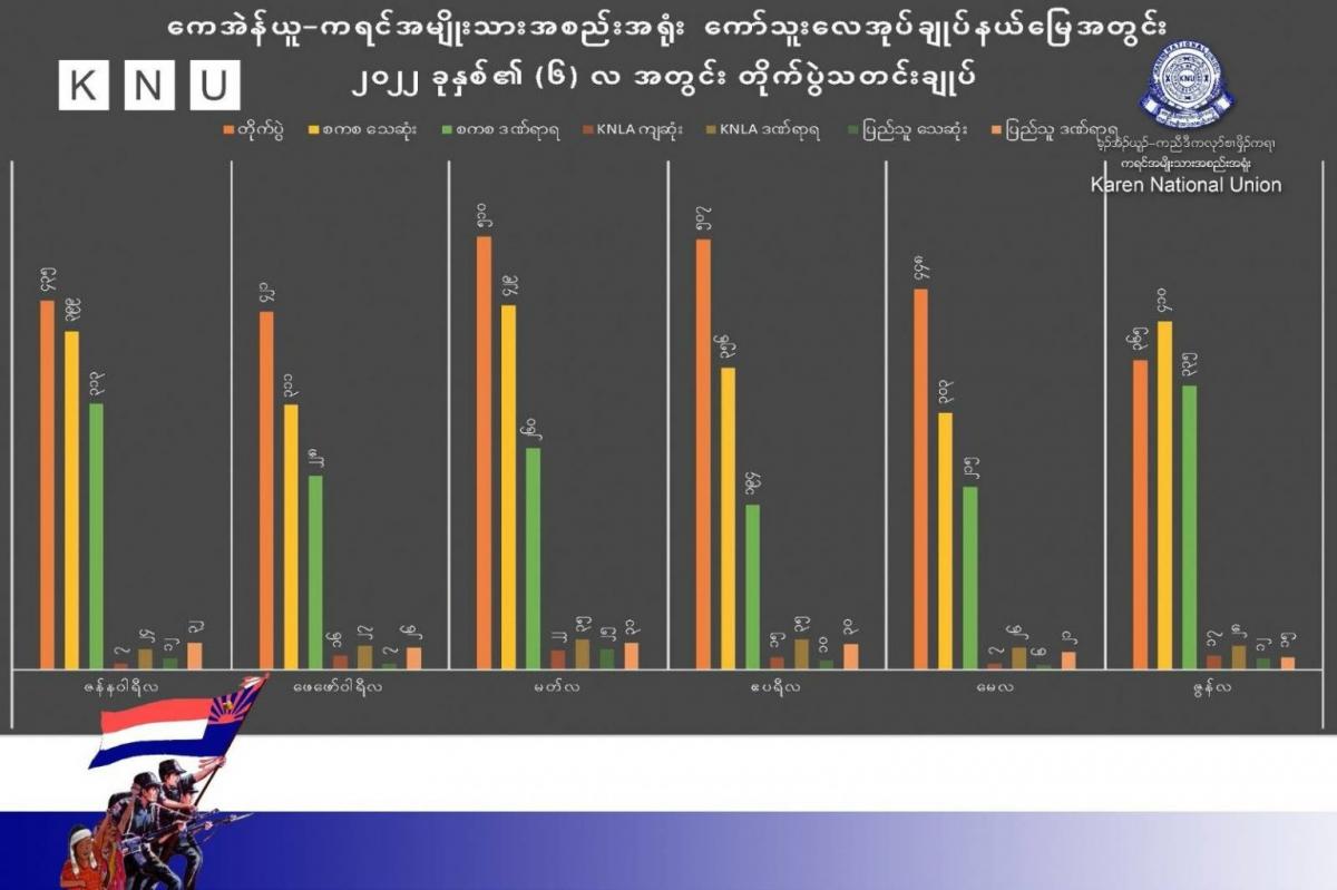 ဇန်နဝါရီလမှစ၍ ပြီးခဲ့သည့် ဇွန်လအထိ KNU ထိန်းချုပ်နယ်မြေတွင် ကရင်အမျိုးသားလွတ်မြောက်ရေး တပ်မတော်-KNLA၊ ကရင်အမျိုးသားကာကွယ်ရေးတပ်မတော်-KNDO နှင့် စစ်ကောင်စီနှင့် ၎င်း၏လက်အောက်ခံ နယ်ခြားစောင့်(BGF) တို့အကြား ဖြစ်ပွားသည့် တိုက်ပွဲပေါင်း (၂,၆၈၆) ကြိမ်တွင် စစ်ကောင်စီဘက်မှ အထိအခိုက် အကျအဆုံးများကာ စုစုပေါင်း (၂,၂၀၈) ဦး သေဆုံးသွားကြောင်း KNU ၏ ထုတ်ပြန်ချက်တွင် ဖော်ပြထားသည်။
