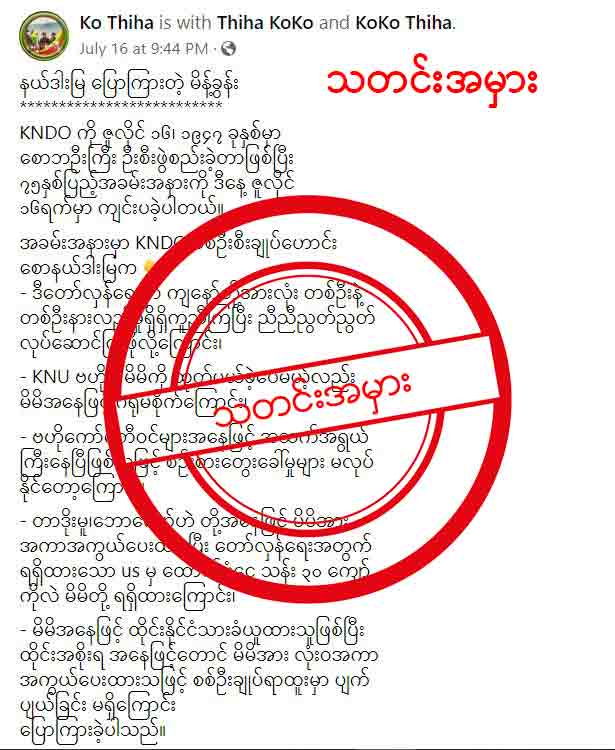 ဒါကြောင့် အချက်အလက်တွေကို စိစစ်လိုက်တဲ့အခါမှာ Ko Thiha ဆိုသူက KNU အဖွဲ့အစည်း အချင်းချင်း ကြား မှာ စည်းလုံးမှုကို ပြိုကွဲစေဖို့နဲ့ CDM ဝင်ရောက်လာတဲ့ စစ်ကောင်စီ တပ်ဖွဲ့ဝင်တွေက ဗိုလ်ချုပ်နယ်ဒါးမြကို အထင်အမြင်မှားအောင် လိမ်ညာ ဝါဒဖြန့်ဖို့အတွက် ရည်ရွယ်ချက်ရှိရှိ ဖန်တီးရေးသားထားတဲ့ သတင်းအမှား ဖြစ်တယ်ဆိုတာကို တွေ့ရပါတယ်။