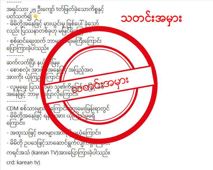ဒါကြောင့် အခုလိုမျိုး နိုင်ငံရေး မတည်မငြိမ်ဖြစ်နေတဲ့ ကာလမှာ သတင်းအမှား ဖြန့်ဝေသူတွေဟာ ပုံစံအမျိုးမျိုး နဲ့ သတင်း အမှားတွေကို ဖန်တီးရေးသား ဖြန့်ဝေနေကြတဲ့အတွက် လူမှုကွန်ရက်တွေကနေ သတင်းတွေကို ဖတ် ပြီး/ကြည့်ပြီး ဖြန့်ဝေတော့မယ်၊ တဆင့်ပြန်ပြီး ပြောပြတော့မယ်ဆိုရင် အမှန်တကယ် ယုံကြည်စိတ်ချရတဲ့ သတင်းဌာနတွေနဲ့ သေချာ တိုက်စစ်ပြီးမှ ထပ်ဆင့်ဖြန့်ဝေ ဖို့လိုပါတယ်။