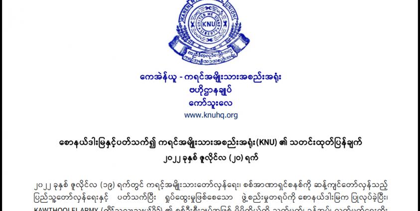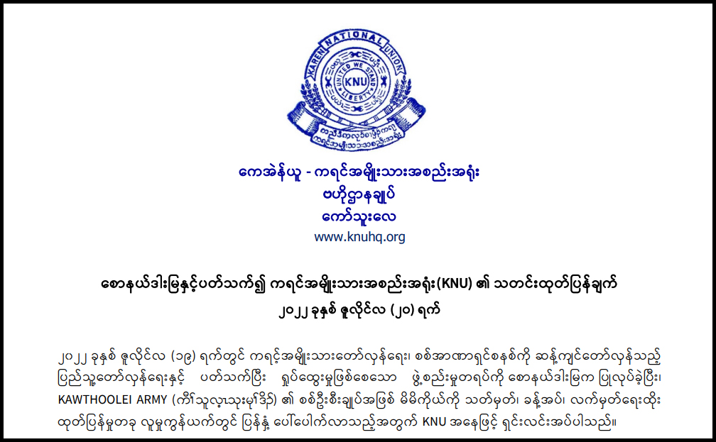 ကေအဲန်ယူခေါင်းဆောင်တချို့သည် စစ်ကောင်စီနှင့် ငြိမ်းချမ်းရေး လုပ်ငန်းစဉ်အရ ပူးပေါင်း လုပ်ဆောင်မှုများ ရှိနေ သေးသည့်အပေါ် ၎င်းတို့လက်အောက်တွင် စစ်အာဏာရှင်ကို အမြစ်ပြတ်ခြေမှုန်း တိုက်ခိုက်ရန် ခက်ခဲလာကြောင်း အကြောင်းပြချက်ဖြင့် ပြီးခဲ့သည့် ဇူလိုင်လ ၁၇ရက်နေ့က ကော်သူးလေတပ်မတော် (Kaw Thoo Lei Army)ကို ဖွဲ့စည်း ကြောင်း ဗိုလ်မှူးချုပ်စောနယ်ဒါးမြက လက်မှတ်ရေးထိုး ထုတ်ပြန်လိုက်ခြင်းအပေါ် KNU ဗဟိုဘက်မှ ၎င်းကို အဖွဲ့အ စည်းမှ ထုတ်ပယ်လိုက်ပြီး ယခုလို ပြန်လည်ရှင်းလင်း ထုတ်ပြန်လိုက်ခြင်းဖြစ်သည်။