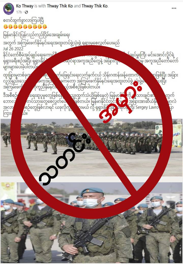 ဒီသတင်းနဲ့ပတ်သက်ပြီး Sergey Lavrov ရဲ့ပြောကြားချက်များကို ရှာဖွေကြည့်တဲ့အခါ ဇူလိုင်လ (၂၅) ရက်နေ့ ရုရှားနိုင်ငံခြားရေးဝန်ကြီး Sergei Lavrov က ကိုင်ရိုရှိ အာရပ်အဖွဲ့ချုပ် သံတမန်များအား ပြောကြားသည့်မိန့်ခွန်းမှာ အနောက်တိုင်းနိုင်ငံများအနေဖြင့် အခြားနိုင်ငံများအပေါ် လွှမ်းမိုးချုပ်ကိုင်ရန် ကြိုးပမ်းနေသည်ဟု စွပ်စွဲပြောကြားခဲ့ပါတယ်။ မြန်မာနိုင်ငံအကြောင်းမပါဝင်ပါဘူး။