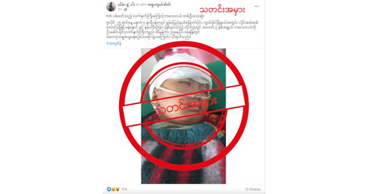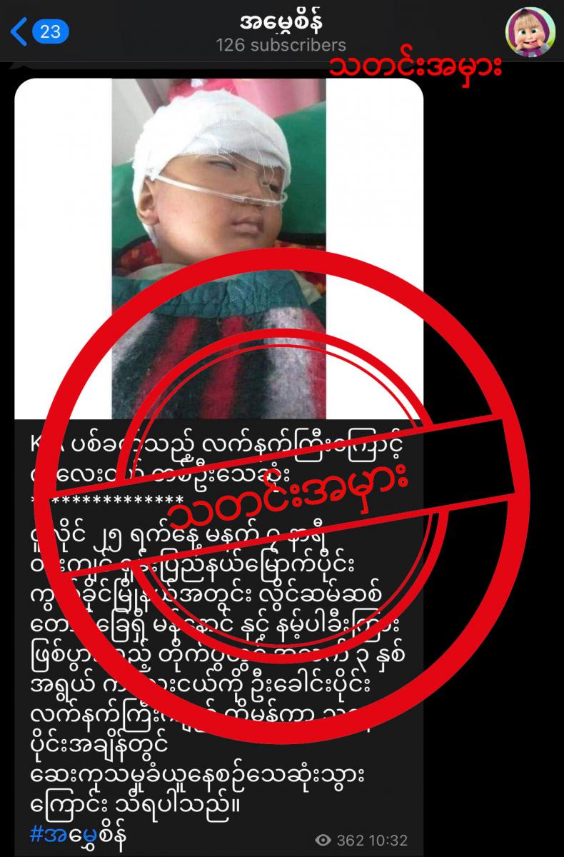 အဆိုပါ ရေးသားမှုဟာ သတင်းအမှား တစ်ခုသာ ဖြစ်ပါတယ်။ ဘာဖြစ်လို့လဲဆိုတော့ ဇူလိုင်လ ၂၅ ရက်နေ့ (မနေ့) က စစ်ကောင်စီတပ်နဲ့ KIA တို့အကြားက တိုက်ပွဲအတွင်း ၃ နှစ်အရွယ် ကလေးငယ်တစ်ဦး လက်နက် ကြီးကျည် ထိမှန်ပြီး သေဆုံးသွားတာ မှန်ပေမယ့် အဲဒီလက်နက်ကြီးကျည်ဟာ ဘယ်အဖွဲ့က ပစ်လိုက်တဲ့ လက် နက်ကြီးကျည်ဆိုတာကို အတိအကျ မသိရသေးပဲ ရေးသားထားလို့ပဲ ဖြစ်ပါတယ်။