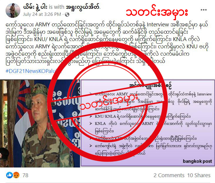KNLA ကို ကော်သူးလေ Army ထဲကို သွတ်သွင်းဖို့အတွက် KNU ဗဟို အဖွဲ့ဝင်တွေကို စည်းရုံးထားပြီ ဖြစ်တဲ့ အ ပြင် KNLA ဒု-စစ်ဦးစီးချုပ် ဒုတိယ ဗိုလ်ချုပ်ကြီး ဘောကျော်ဟဲ လက်မခံပါက ရှင်းလင်းသွားမည်ဖြစ်တယ်လို့ ဗိုလ်မှူးချုပ် နယ်ဒါးမြက ပြောတယ်ဆိုပြီး ရေးသားထားတဲ့ သတင်းပို့စ်တစ်ခုကို ယိမ်း နွဲ့ ပါး ဆိုသူ Facebook အကောင့်ပိုင်ရှင်က ဇူလိုင်လ ၂၄ ရက်နေ့က ရေးတင်ထားပါတယ်။